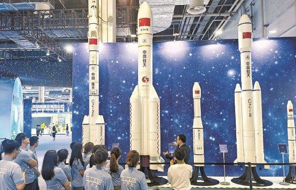航天产业成就展区汇聚了中国航天科技集团有限公司、中国航天科工集团有限公司等众多航天领域知名企业,展示了我国航天产业的实力和创新成果。中国航天科技集团带来了长征十二B、长征八号系列、长征六号、捷龙等运载及商业型号,以及卫星应用及商星配套、御蜂反无人机系统、固态增材设备等;中国航天科工集团展示了快舟十一号运载火箭(1:10)车载箭模型、“楚天”超低轨通遥一体星座等。此外,中科星图股份有限公司的基于环形网络的新一代火箭测量系统,东方空间科技有限公司的引力一号1:15模型、原力-110发动机等,展示了我国商业航天创新成果。